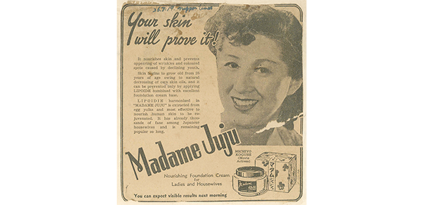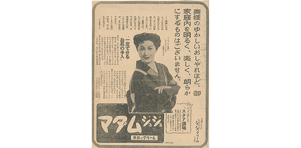 当時、マダムジュジュは戦後の自由を楽しむ女性たちに、次々と新しいお化粧法を提案し続けました。クレンジング後、おやすみ前にマダムジュジュを少し厚めに塗る、パックのような使用方法や、当時主流だった「粉化粧」を自然に落ち着かせ、長持ちさせる化粧下地としての使用方法です。